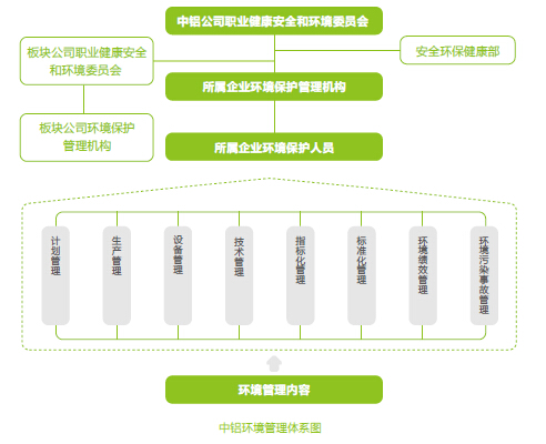 中鋁公司總部及實(shí)體企業(yè)都設(shè)有職業(yè)健康安全和環(huán)境委員會(huì),公司及企業(yè)法定代表人是環(huán)境保護(hù)管理的第一責(zé)任人。我們實(shí)行生產(chǎn)與環(huán)保統(tǒng)一管理、統(tǒng)一檢查、統(tǒng)一考核,建立健全環(huán)境保護(hù)崗位責(zé)任制,形成全面、全員、全過(guò)程的環(huán)境保護(hù)管理體系。2013年,公司ISO14000環(huán)境管理體系有效運(yùn)行。